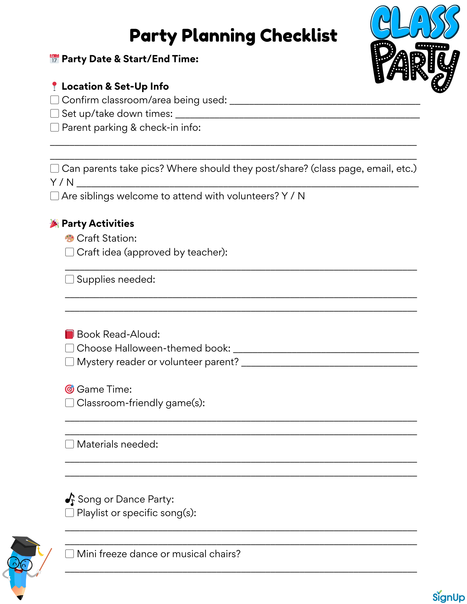 Planning classroom fun doesn’t have to be chaotic. With SignUp, organizing volunteers, gathering supplies, and rallying parent helpers is a total breeze from the first bell to the last. Snag our free printable Class Party Planning Checklist below — perfect for any celebration, any season, all school year long. Just click, print, and turn party prep into pure easy-peasy magic! 🪄
